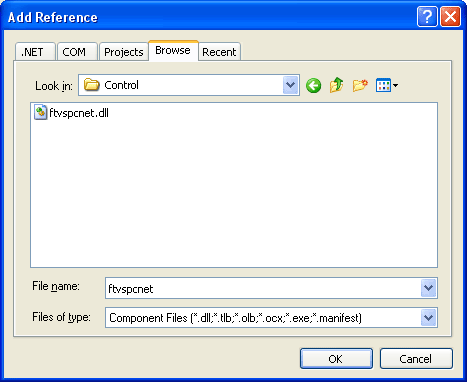 Note: If FTVSPCControl is not displayed in the list of .NET Components, click Browse and select ftvspcnet.dll from C:\Program Files\Virtual Serial Port Control\Microsoft.NET\Control\ folder.